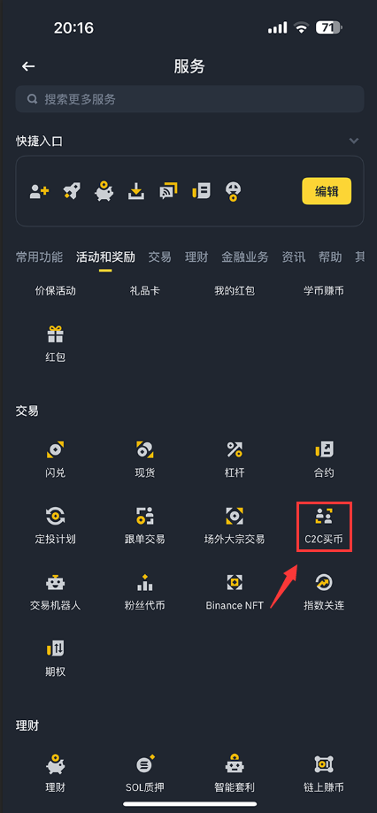 打开币安APP,点击首页的"买币",选择"C2C交易"