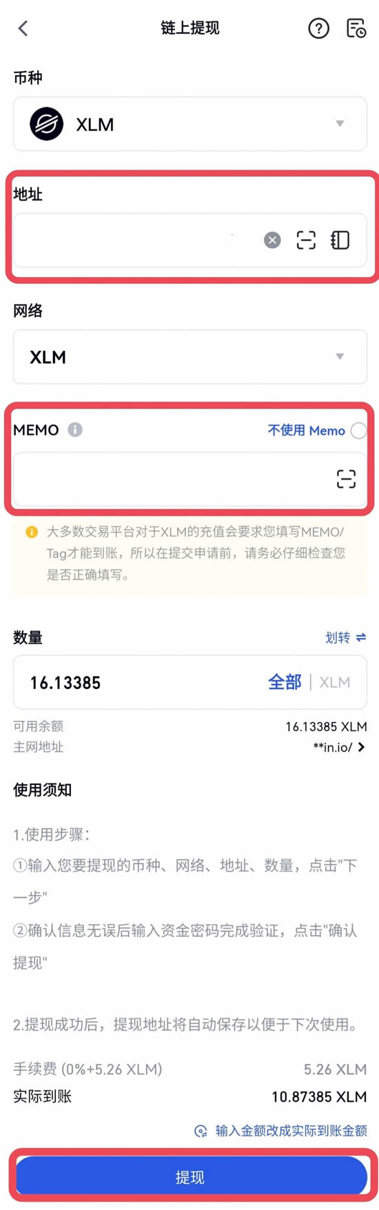 3、在提现页面,按照提示填写正确信息,包括提现地址、提现数量和正确的Memo。确认信息无误后,点击"下提现"。