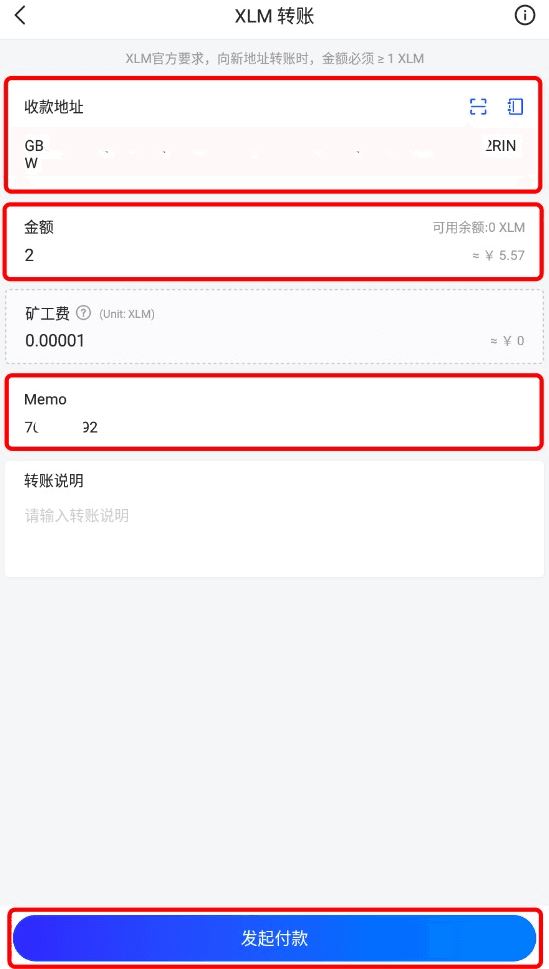 4、在转币页面,你需要填写收款地址、转账金额以及指定的Memo信息。