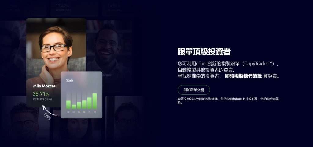 正如前面提到的,eToro提供跟单交易功能。在投资页面中找到"CopyTrader",就可以查看不同的投资者,您可以选择感兴趣的交易者进行复制跟单。