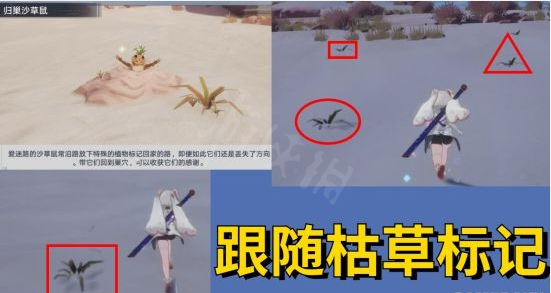 答案:找到会发光的土堆作为探索点,然后寻找并跟随枯草标记。