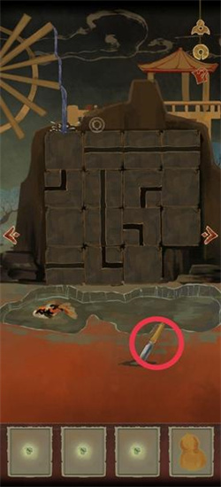 6、接着我们把种子种在拔出匕首的坑中,用匕首劈开葫芦,舀水,浇水,再用玉石催化,把蝴蝶放花上传粉,就会飞出一只鸟把鱼带走,留下个盒子。